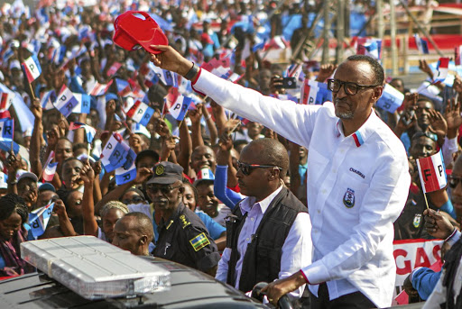 Rwandan President Paul Kagame of the ruling Rwandan Patriotic Front (RPF), waves to his supporters during his final campaign rally in Kigali, Rwanda August 2, 2017. REUTERS/Jean Bizimana - RTS1A4MM